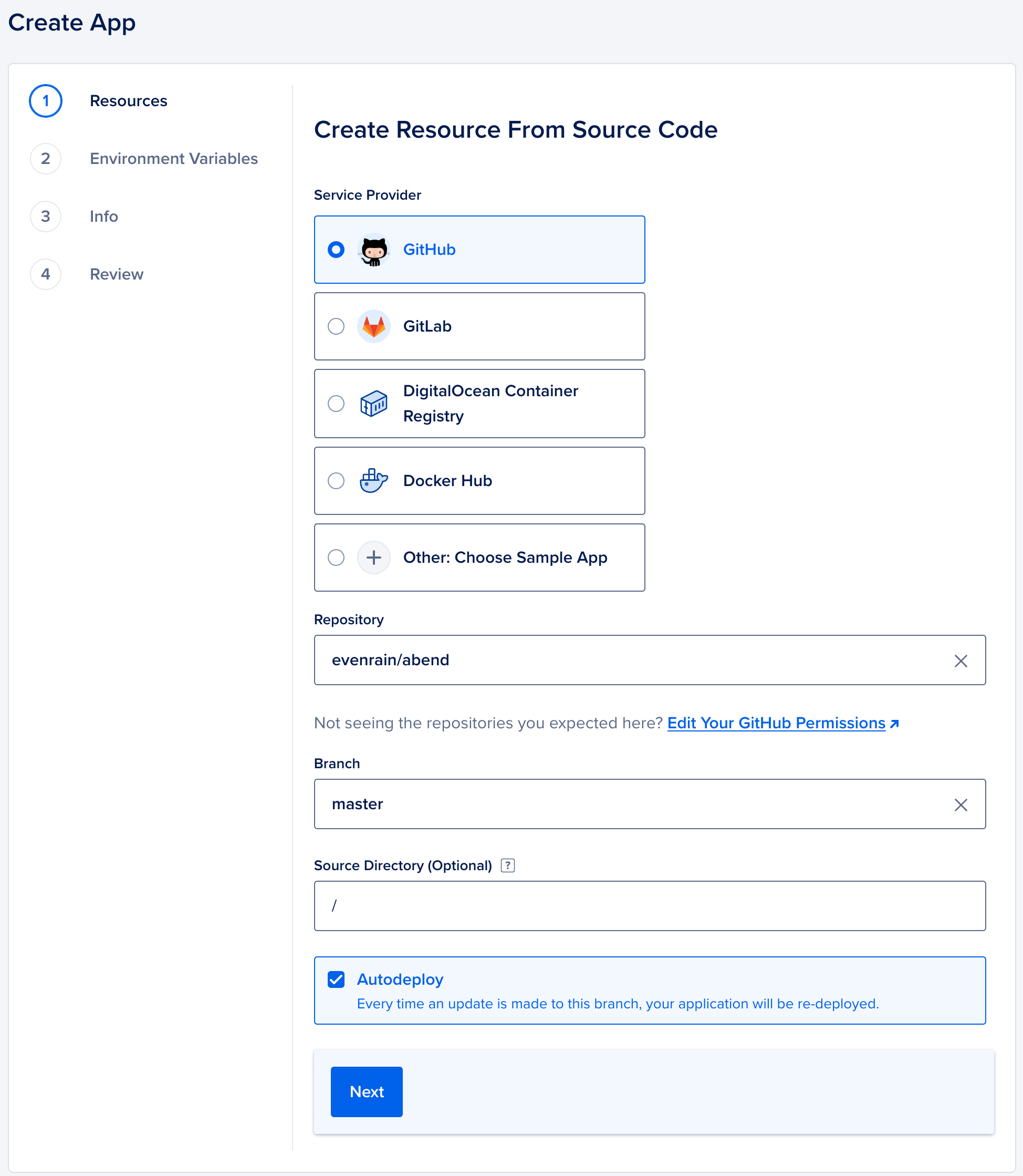 前面提過我的 Hugo 是部署在 DigitalOcean Apps,我們也需要到平台上開新的 App。授權 GitHub 權限、選擇 Repo,其他設定基本上不太需要更動