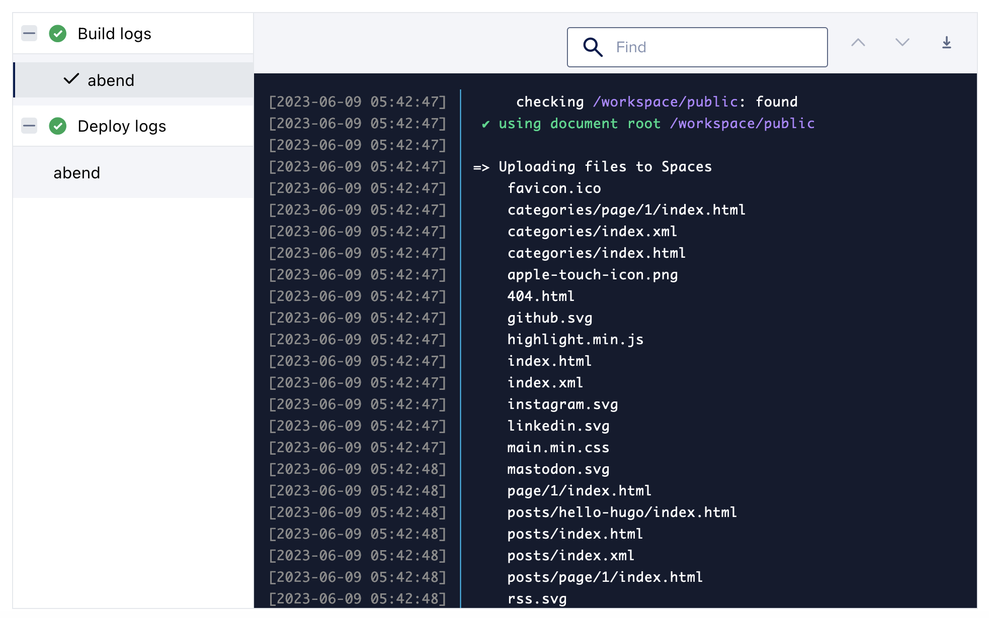 完成後 DigitalOcean Apps 會嘗試第一次部署,可以看見 DigitalOcean 把檔案都轉成靜態檔案,本文的 hello-hugo.md 也轉換成 /hello-hugo/index.html