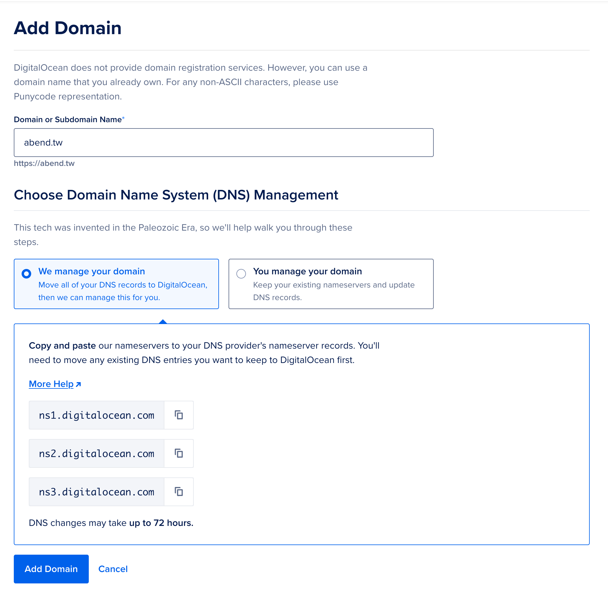 最後就是把網域換成我們自己的網域,因為我的網域只有要拿來跑 Hugo,所以直接使用 DigitalOcean 的 DNS 就好